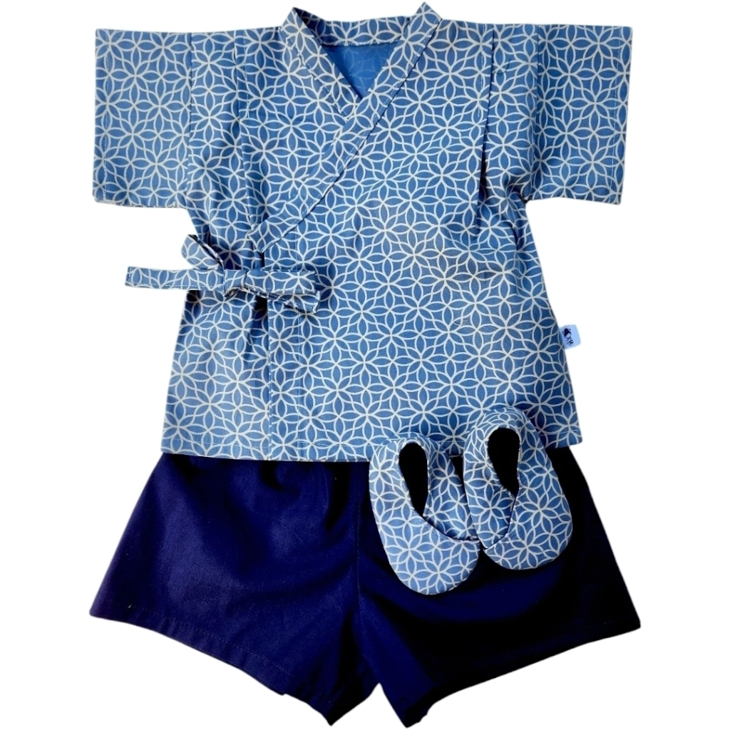 Kit Kimono Umi, uma peça única que une a sofisticação da moda e a tradição japonesa. Com uma estampa geométrica azul inspirada nas estampas tradicionais do Japão, este kimono é ideal para os pequenos que buscam conforto e estilo.